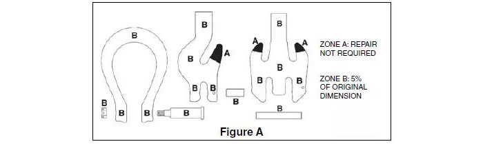 ● 停止使用:集成主環(huán)或配件如出現(xiàn)裂紋,缺口時(shí),需要請專業(yè)人員對產(chǎn)品進(jìn)行修理,專業(yè)人員必須沿鍛件輪廓進(jìn)行垂直磨修,并保證尺寸的損耗不超過表 fig A 中規(guī)定的范圍,如超出此范圍,則產(chǎn)品不能再使用。