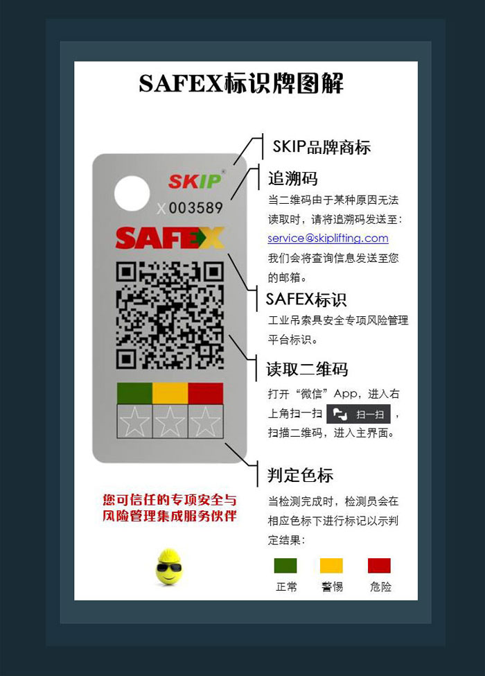 《一般用途鋼絲繩吊索特性和技術(shù)條件》(GB/T 16762-2009 )7.1.3條規(guī)定:包裝前每件吊索都應(yīng)掛有標(biāo)簽,標(biāo)牌上應(yīng)注有吊索的執(zhí)行標(biāo)準(zhǔn)、直徑長度、額定工作載荷和產(chǎn)品編號(hào)。今天就帶你了解一下不一樣的SafeX索具標(biāo)牌。