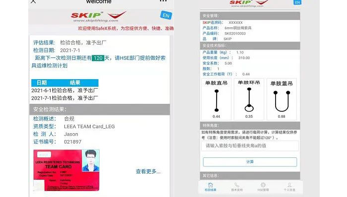 上圖為SAFEX系統(tǒng)主界面,我們看到他主要顯示了索具的評(píng)估結(jié)果、精確的過往檢驗(yàn)日期和下次檢驗(yàn)日期、索具的檢驗(yàn)人及資質(zhì)、索具的基本信息、安全技術(shù)指標(biāo)和一套非常實(shí)用的載荷計(jì)算小工具。這套系統(tǒng)界面中的信息能幫助使用者更好的了解產(chǎn)品的安全性能,在索具檢測(cè)時(shí)也能更完整清晰的記錄檢測(cè)信息,SAFEX為您的安全管理細(xì)節(jié)賦能!