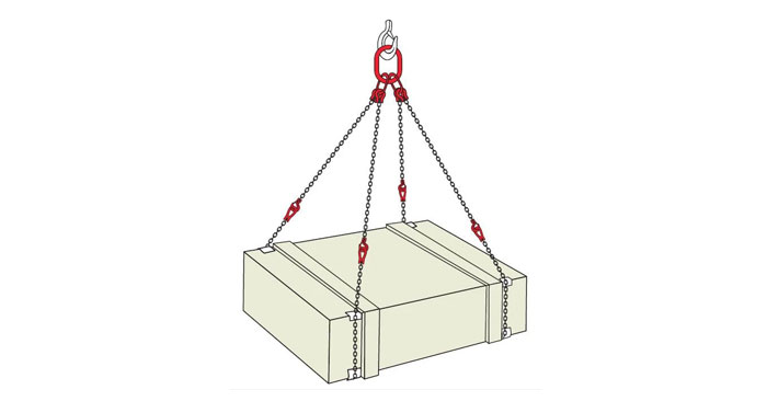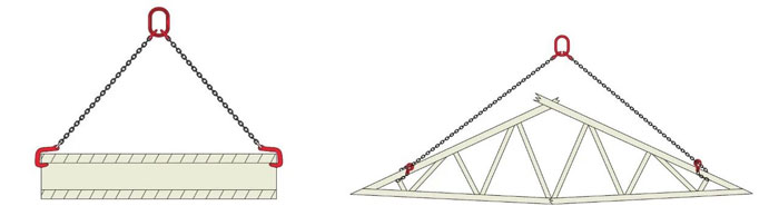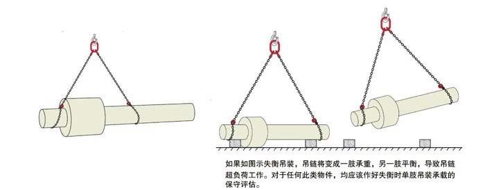 大件包裝箱,鋼板等可以使用雙肢花籃式吊裝搬運(yùn),但是使用四肢吊鏈與兩套速裝連接輔環(huán)套具配合更方便。所有的鏈條應(yīng)該保持規(guī)格一致。