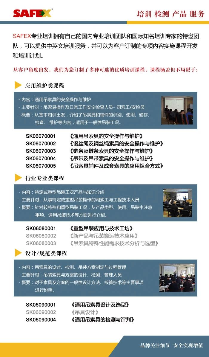 GLE作為一家專業(yè)的工業(yè)吊裝工程與索具產(chǎn)品服務(wù)供應(yīng)商,為您提供系統(tǒng)的吊索具技能培訓(xùn)課程(適合司索工/安檢員/工程技術(shù)人員/安全管理人員等)和在用設(shè)備全面檢測(cè)服務(wù)(適合公司日常性設(shè)備和索具的檢測(cè))。