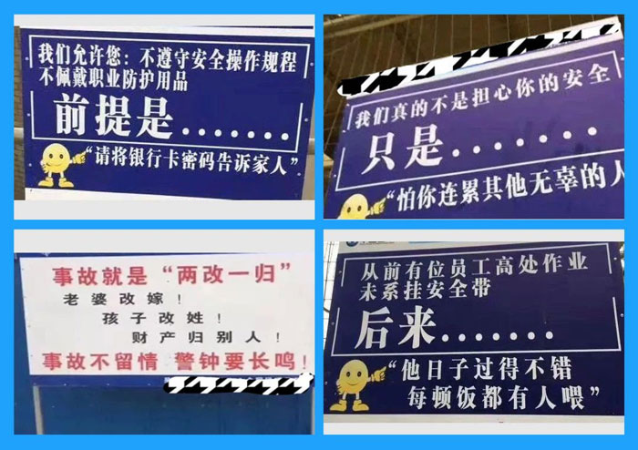 ……這些看起來像段子的警示標(biāo)語,都來源于真實(shí)的安全事件,看完這些標(biāo)語,您還敢在安全上馬虎嗎? 安全關(guān)乎生命,它不是一個(gè)笑話,但是如果漠視它,你就可能成為一個(gè)笑話。就如墨菲定律在安全中的啟示:不要心存僥幸,否則就會導(dǎo)致災(zāi)難。即使發(fā)生造成1人死亡的事故,對于企業(yè)來說僅僅是一般事故,而對于死者本人、家庭,損失是“重大”的,而且絕對可以稱之為“特大”事故。所以安全對自已,對家庭是責(zé)任、是效益、是幸福、是一切,安全的最大受益者是我們自己!對別人、對企業(yè),安全不光是態(tài)度和意識,它是一種承諾,更是專業(yè)行為,一種管理收益。